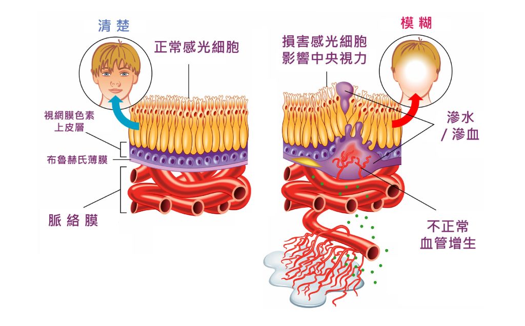 老年黃斑病變可分乾性和濕性,乾性老年黃斑病變佔當中的90%。乾性老年黃斑病變屬慢性眼疾,通常以年計算,隨着時間逐漸令中心視力下降,雖然其症狀比較沒那麼嚴重,但與濕性的病人一樣,最終有機會造成失明。
