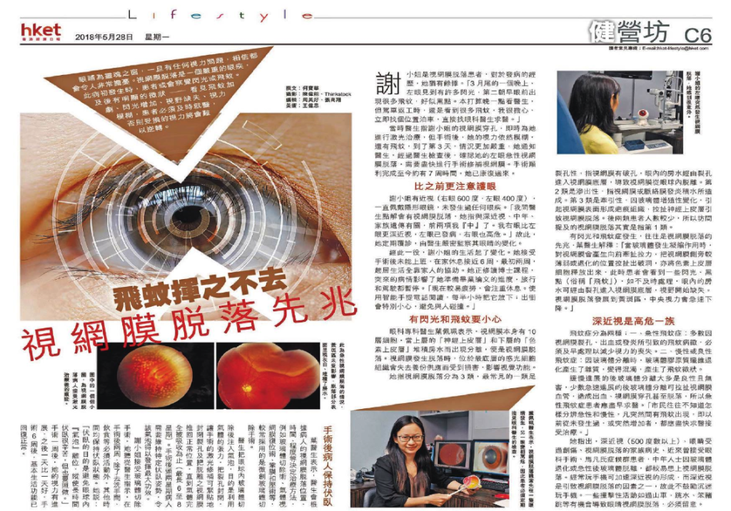 當時醫生指謝小姐的視網膜穿孔,即時為她進行激光治療,但手術後,她的視力依然模糊,還有飛蚊,到了第3天,情況更加嚴重,她通知醫生,經過醫生檢查後,確認她的左眼急性視網膜脫落,需要盡快進行手術修補視網膜。手術順利完成至今約有7周時間,她已康復過來。