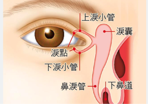 泪小管是从眼睛延伸到泪囊的管状结构。泪小管的末端,即上泪点和下泪点,位于眼睑内侧。眨眼除了令眼泪平均分布在眼表外,这个动作还会导致泪囊短暂打开,产生负压,吸引眼泪通过泪小点和泪小管排走,眼泪从而由泪囊通过鼻子排出,最终流到喉咙。这解释了在滴眼药时感到喉咙苦涩的现象。