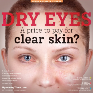 研究表明,30% 至 50% 接受異維A酸治療痤瘡的患者出現乾眼症狀。一般認為,異維A酸對瞼板腺的作用與對皮膚皮脂腺的作用相似。瞼板腺Meibomian gland 是一個巨大的及特殊分化的皮脂腺(differentiated sebaceous gland) 。異維A酸可以縮小皮脂腺組織,改善皮脂腺功能狀態。但它亦可同時導致瞼板腺功能障礙(MGD) 、缺油、乾眼、淚水加速蒸發。所以,異維A酸引起的眼部症狀越來越受到關注。有乾眼症的患者不能吃異維A酸,因為異維A酸會影響患者淚液分泌。